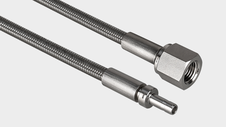 PTFE 衬里金属软管内层软管为 PTFE 材质,具有具有优异的耐化学性,而且还具有防油防水、摩擦系数低、耐磨损等特点。外编织层材料为 304 不锈钢,工作压力可达 207 bar (3000 psig),公称软管尺寸从 1/8" 至 1",工作温度从 -53 至 204℃(-65°F 至 400°F),结构轻便,易于操作和安装,有标准长度和可定制长度可供选择。