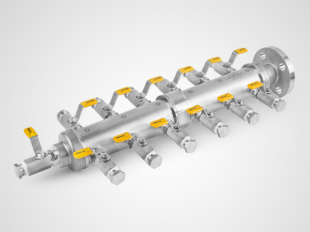 气源分配器或者分流阀组,都是一种气源分配辅助装置,把单路气源分配给多路使用。气源分配器(风暴娱乐AH系列)是由管子制成,分流阀组(风暴娱乐CM系列)是由棒材加工而成。气源分配器一般是用螺纹或者法兰的方式和供气箱连接,由一条管路送至气源分配器,再分配供气至各单台仪表。其主要优点为安装方便、操作简单、便于仪表维修、节省成本,广泛应用于如化工、医药、电力以及纺织等行业。分流阀组采用紧凑型设计,具有背密封功能,广泛用于石化行业中。